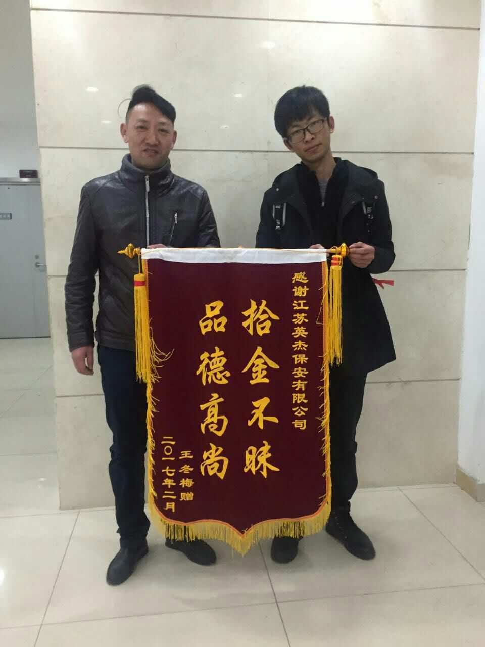 2018年3月16日,江蘇英杰保安服務(wù)有限公司駐江陰海岸保安隊長王飛在工作期間巡查時,在一號門附近拾到一只錢包,內(nèi)有三千人民幣及銀行卡多張,王飛同志及時聯(lián)系失主并予以歸還,失主為此送來錦旗表示感謝。王飛拾金不昧的品德得到了江陰市海岸商業(yè)管理有限公司的通報表揚。希望我公司全體員工以王飛同志為榜樣,腳踏實地、愛崗敬業(yè),為公司發(fā)展積極奉獻(xiàn)智慧和力量。...